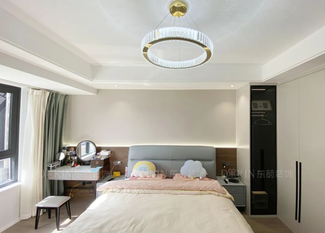 次卧室中的色调与公共空间相呼应,采用了白色,撞色窗帘点缀整个空间,让嘈杂的生活瞬间安静下来,带人走入静谧舒适的休憩氛围。