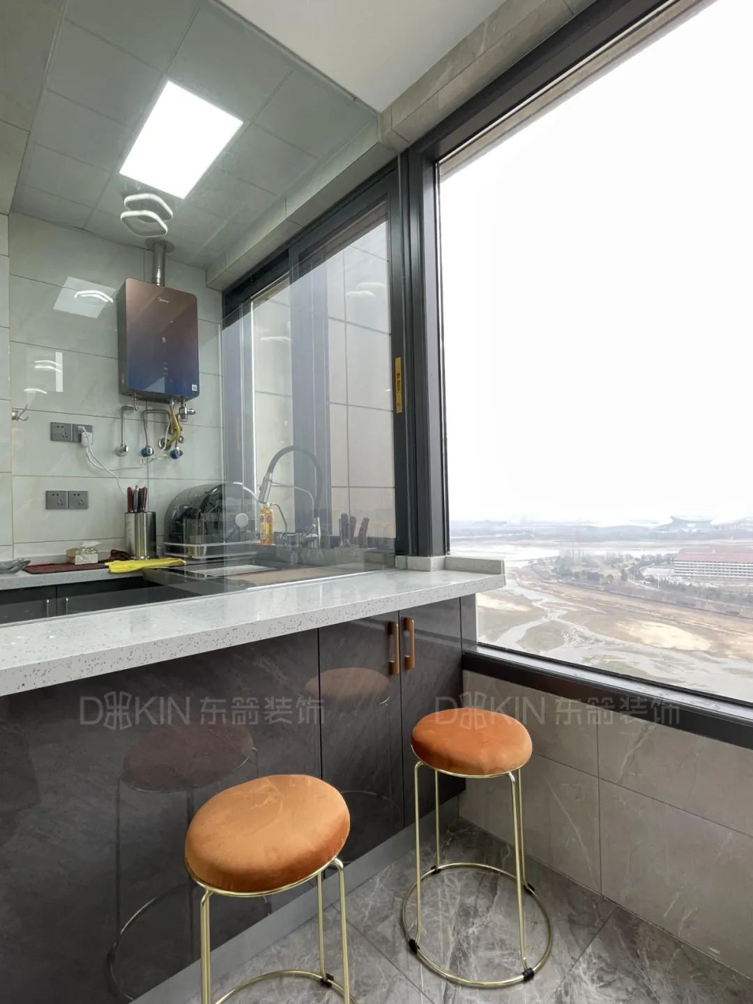 1.厨房为L型设计,墙面镂空做了玻璃和西厨台面更显档次。
