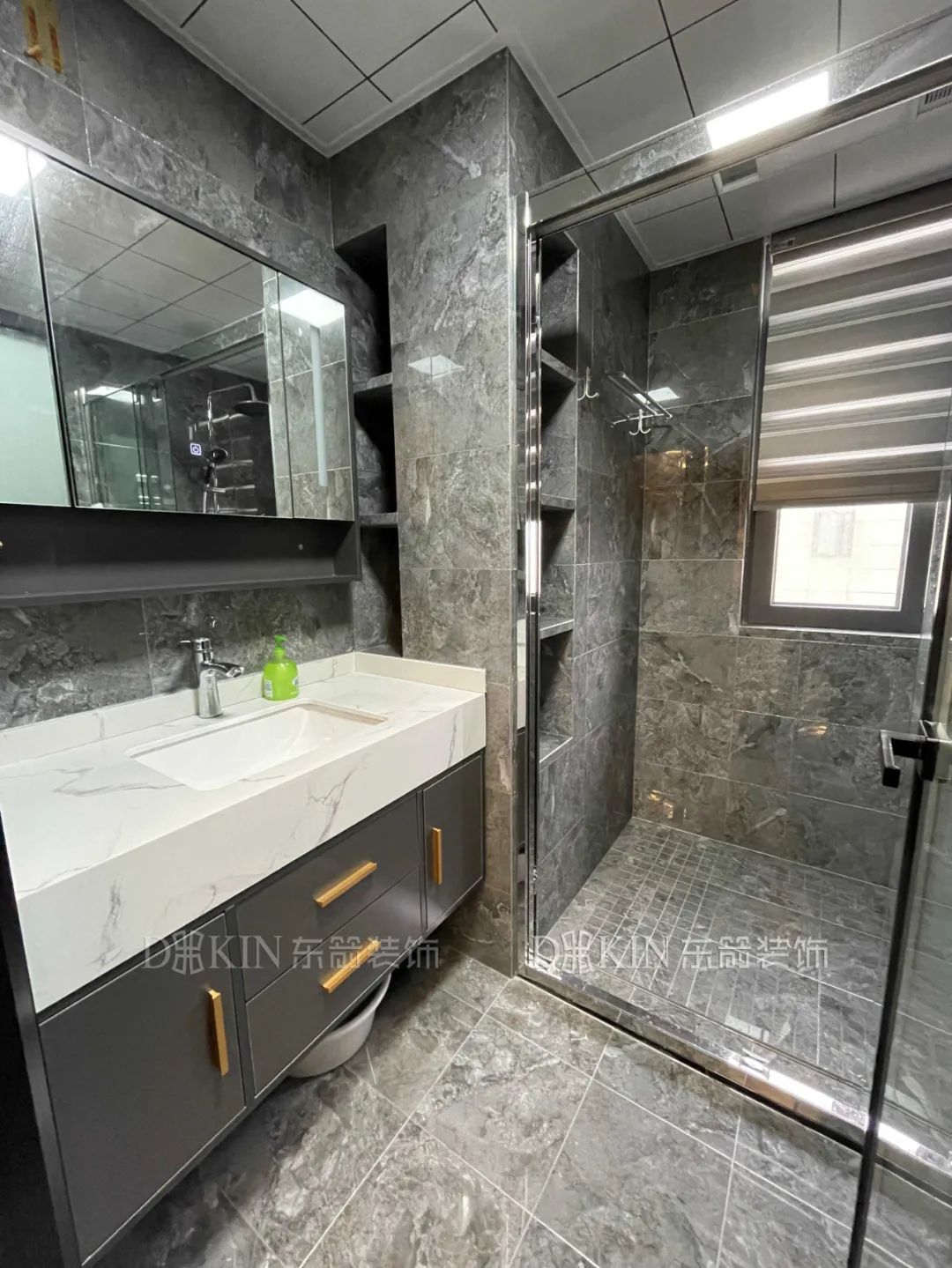 浴室用玻璃隔断做了干湿分离,透明玻璃让空间更通透,浴室柜碰撞出有格调的质感。