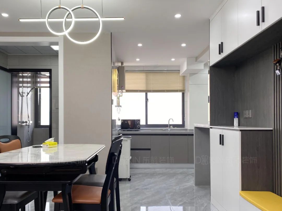 餐厅与开放式厨房相呼应,餐座、吊灯、组合柜,其乐融融的氛围感油然而生。一家人围坐享用美食,真是再好不过。