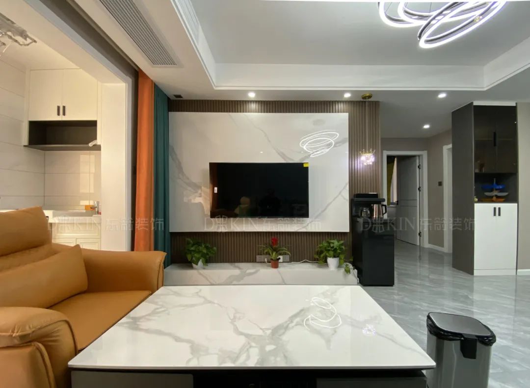 4.电视背景墙采用的是岩板、木饰面、壁台设计,软装偏向现代感。